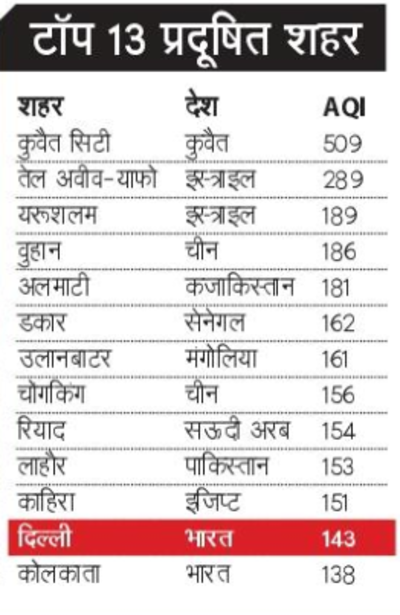 दिल्ली के लोगों लिए राहत भरी खबर, विश्व के टॉप-10 प्रदूषित शहरों की सूची से दिल्ली बाहर,अब 12वें स्थान पर,कुवैत सिटी सबसे प्रदूषित शहर